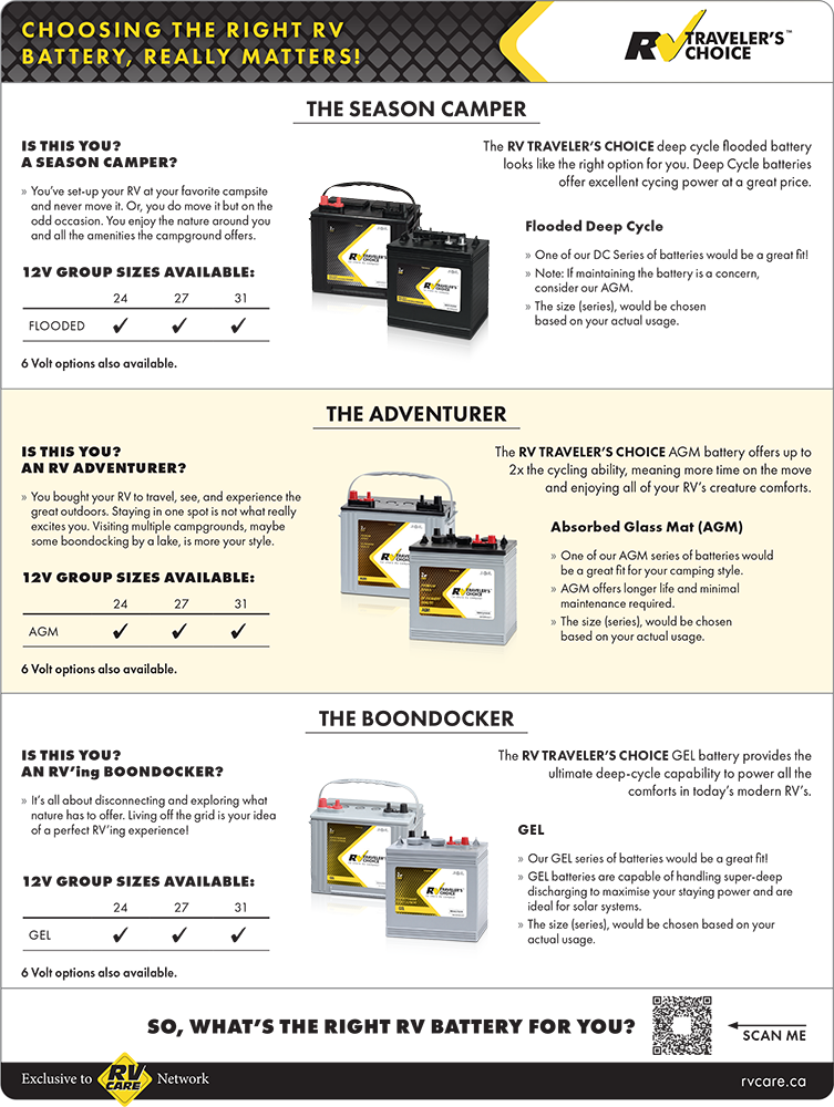 RV Care Traveler’s Choice deep cycle batteries are optimized for RV use.
